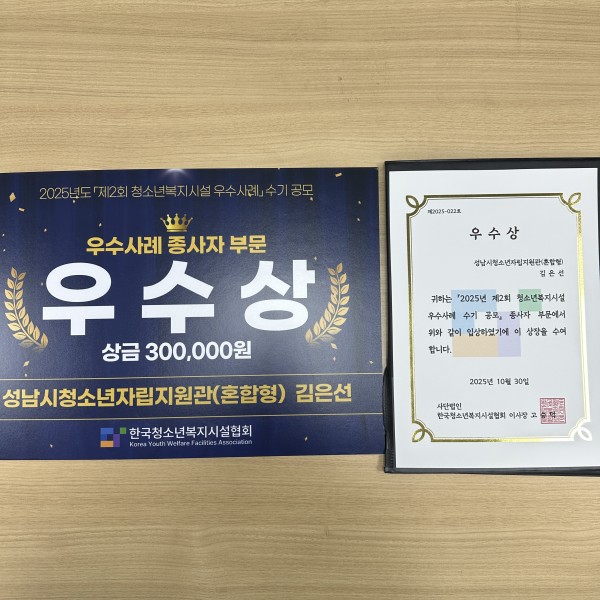 자립지원&쉐어 | [ 자립지원 & 쉐어 ] 2025년 제2회 청소년복지시설 우수사례 공모전 시상식 - 김은선 선생님 페이지 정보 작성자 안나의집 작성일25-11-18 08:55 관련링크 이전글 다음글 목록 본문 [한국청소년복지시설협회에서 주관한 '2025년 제2회 청소년복지시설 우수사례 공모전'에서 종사자 김은선 선생님 우수상 수상] 이전글 다음글 목록
